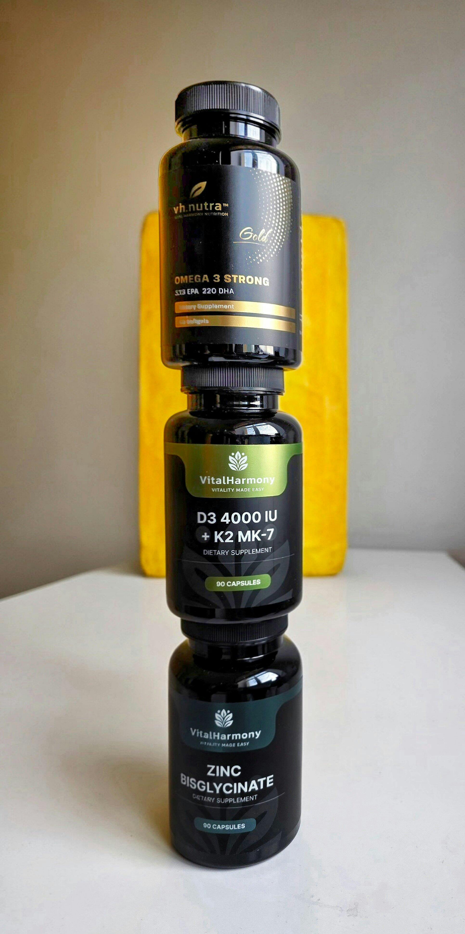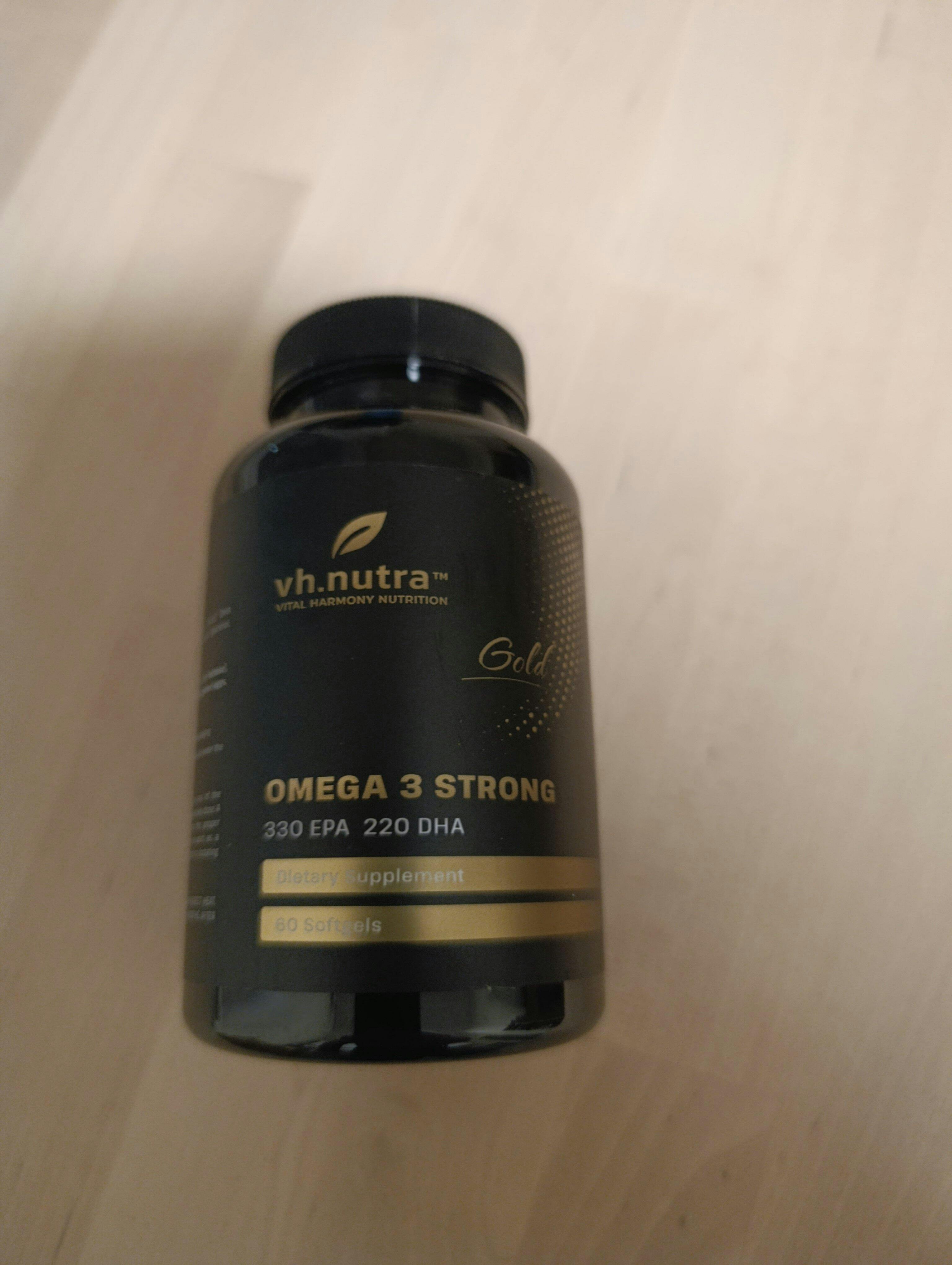 VH.Nutra Omega 3 Strong ir augstas kvalitātes zivju eļļas uztura bagātinātājs ar augstu būtisko omega-3 taukskābju koncentrāciju — EPA (330 mg) un DHA (220 mg) vienā kapsulā. Šīs vērtīgās taukskābes veicina sirds veselību, smadzeņu darbību, redzi un vispārējo labsajūtu.
